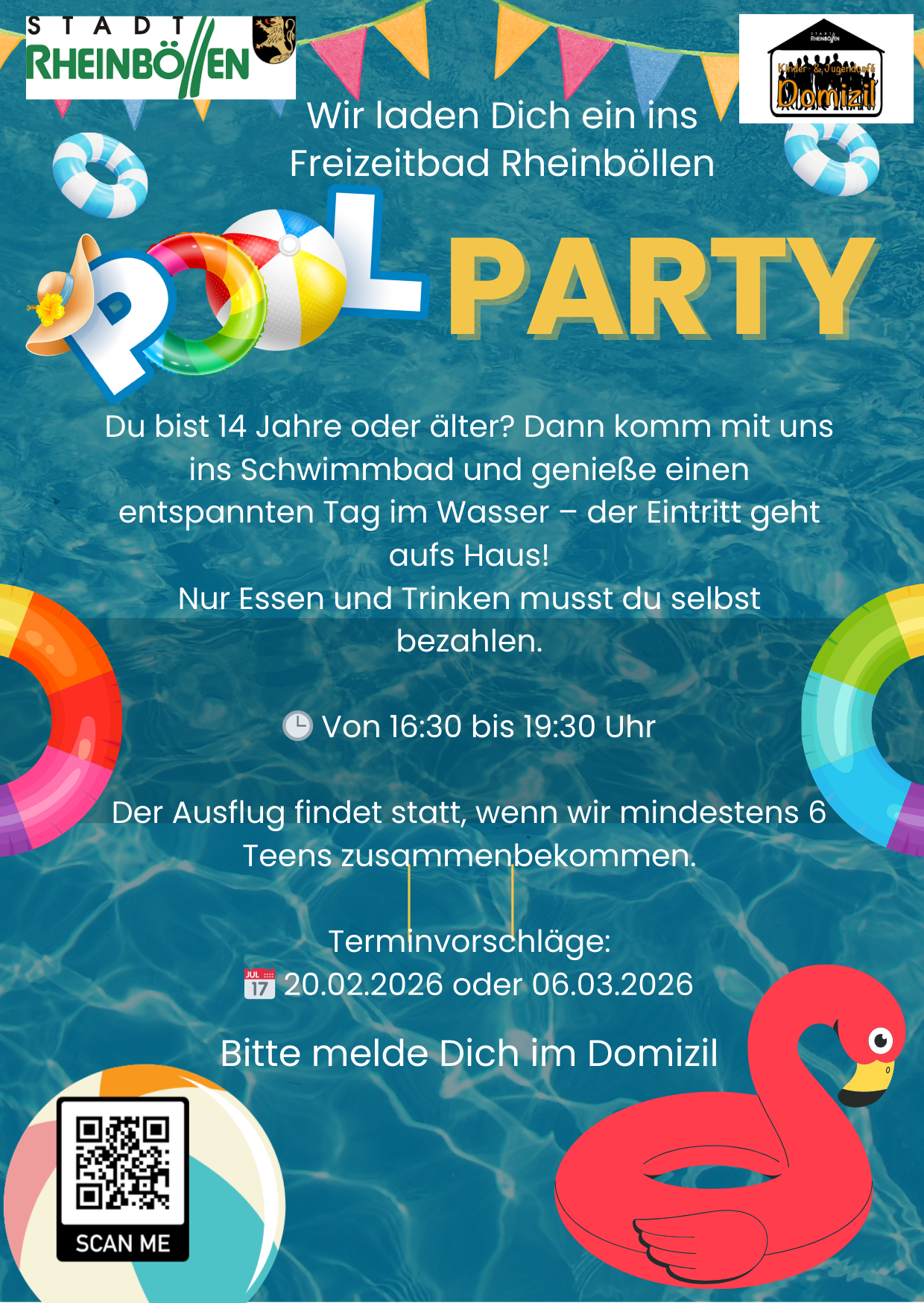 - 20.02 / 06.03.26 Pool Party (Wir gehen mit den Teens ab 14J. Schwimmen im Freizeitbad Rheinböllen)